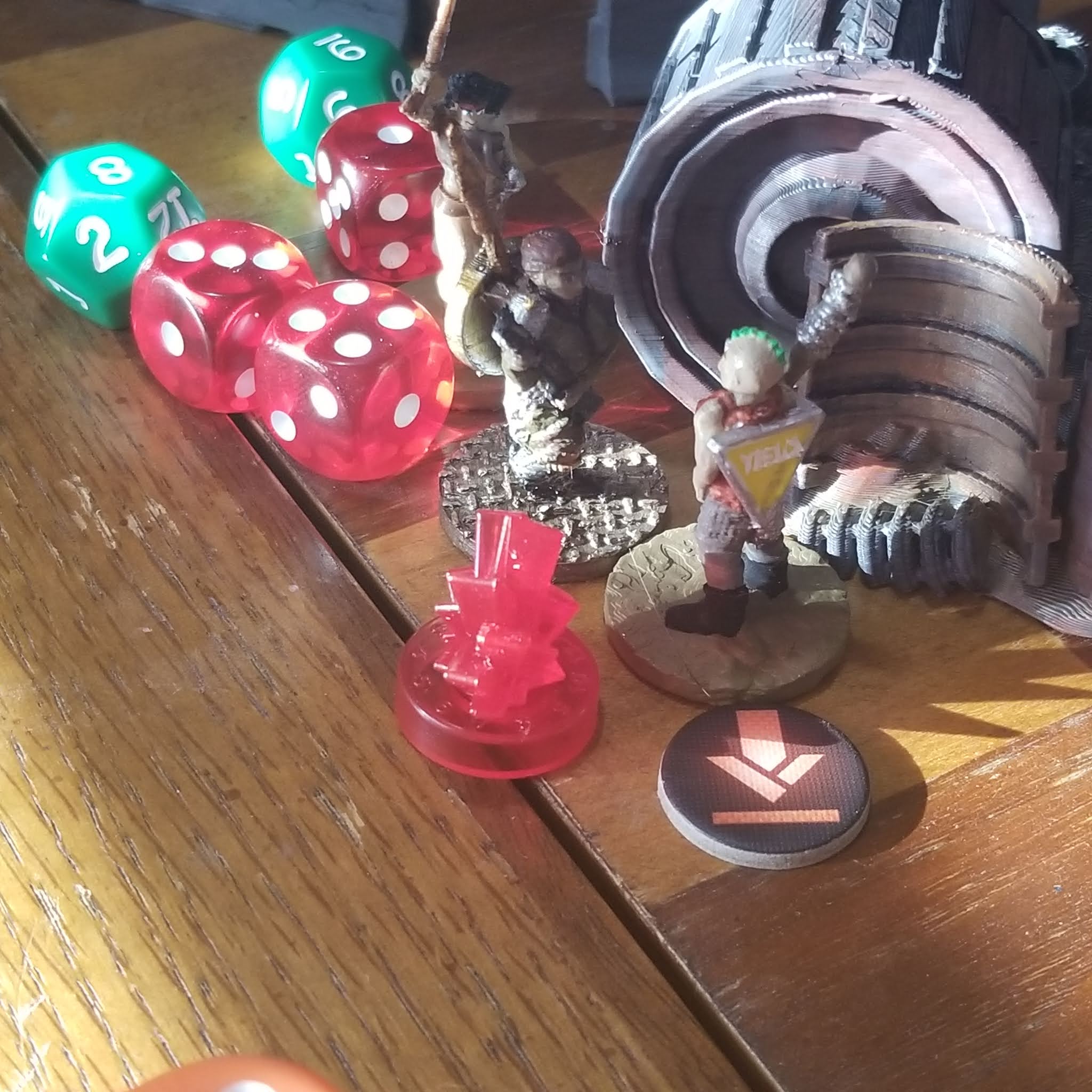 This was the first battle I played over the course of a couple of days, and it was nice how easy it was to pick it up again after setting it down again. Even better, I realized between sessions that I had almost forgotten to make ammo rolls for the enemy units this time, so I was able to correct that almost immediately. Good thing too-- two of the enemy scrags got ammo failures later in the game.